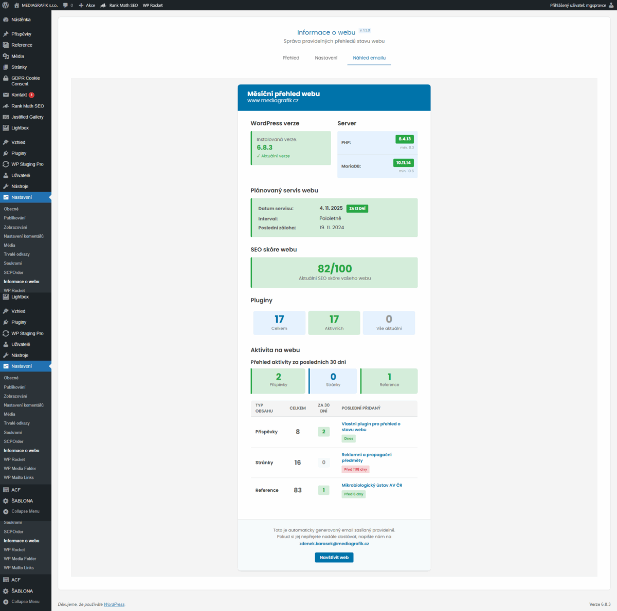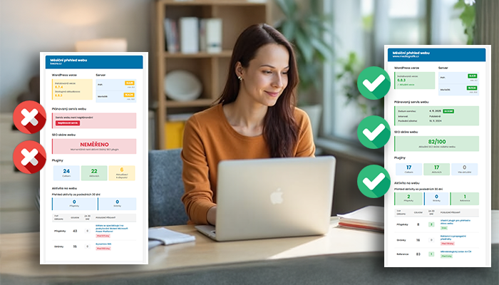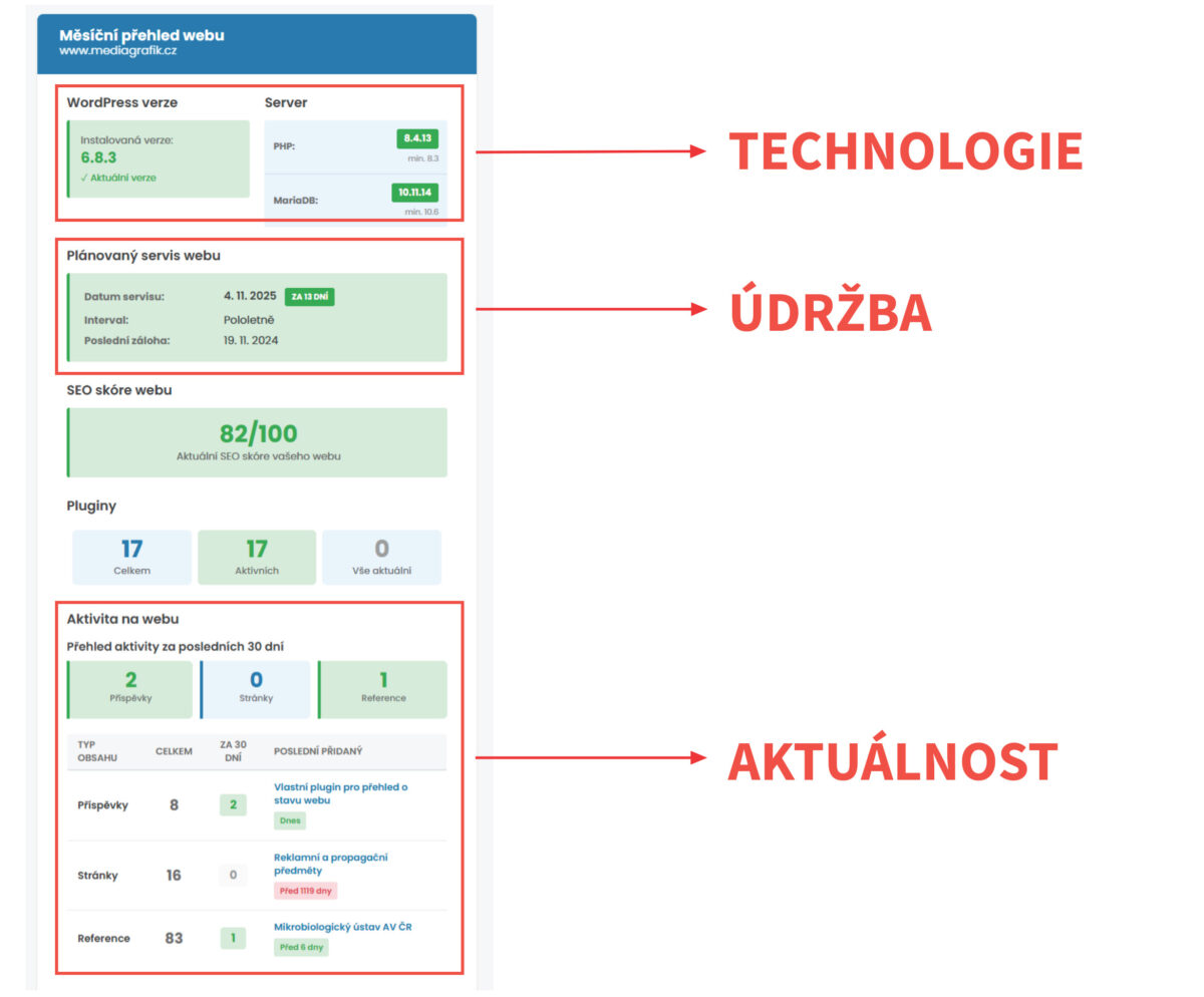 WordPress, pluginy i hosting se každý měsíc mění a vyvíjejí. A protože nechceme, aby se naši klienti o svých webech dozvídali až ve chvíli, kdy „něco přestane fungovat“, vyvinuli jsme vlastní plugin, který sleduje stav webu a automaticky o něm posílá přehledné měsíční reporty.