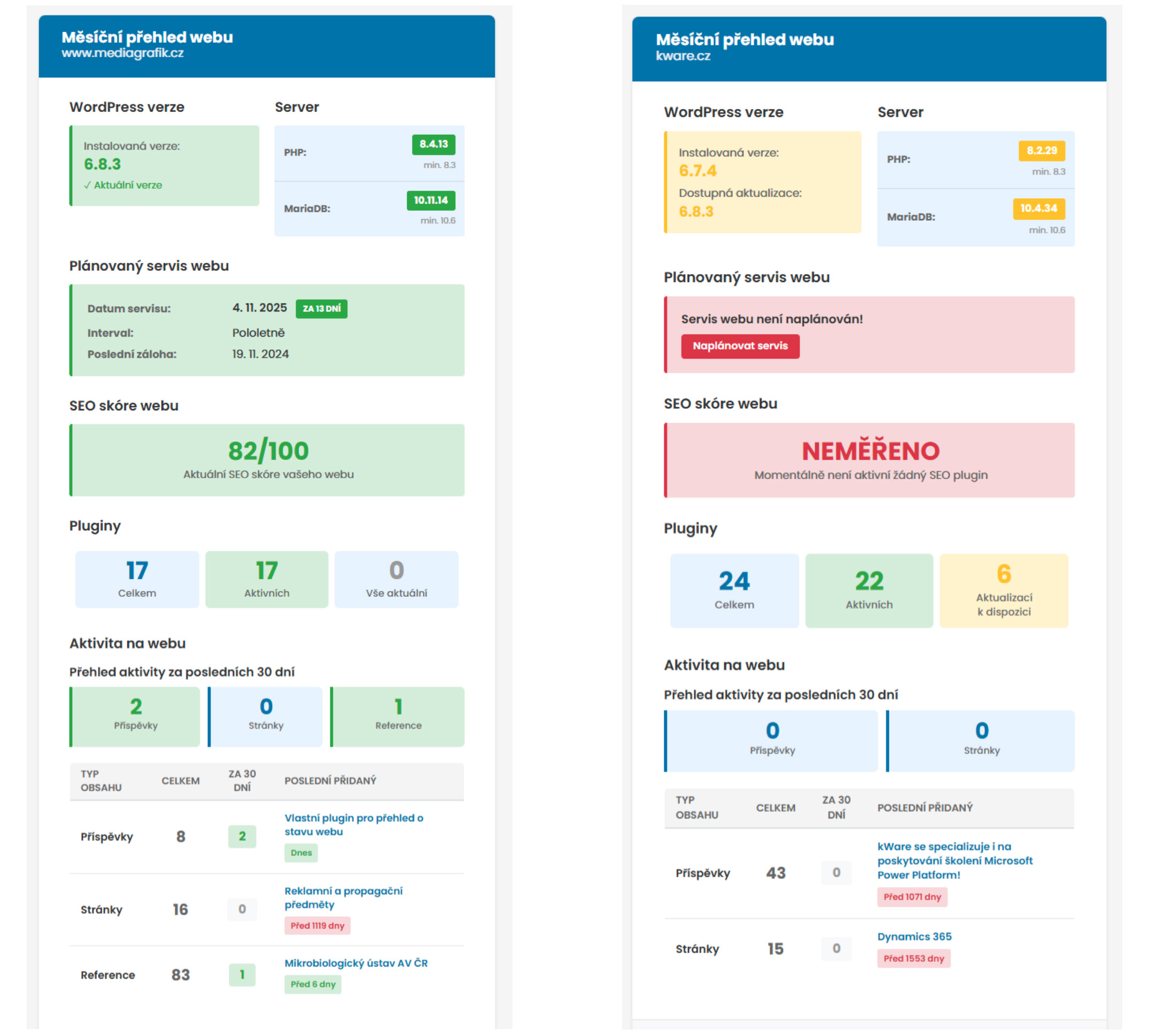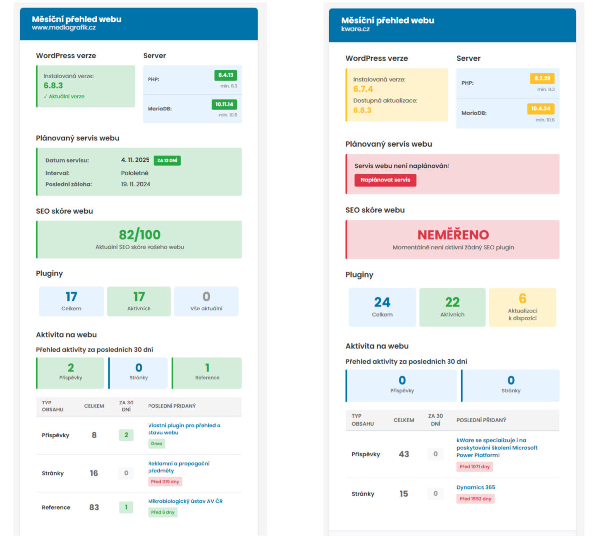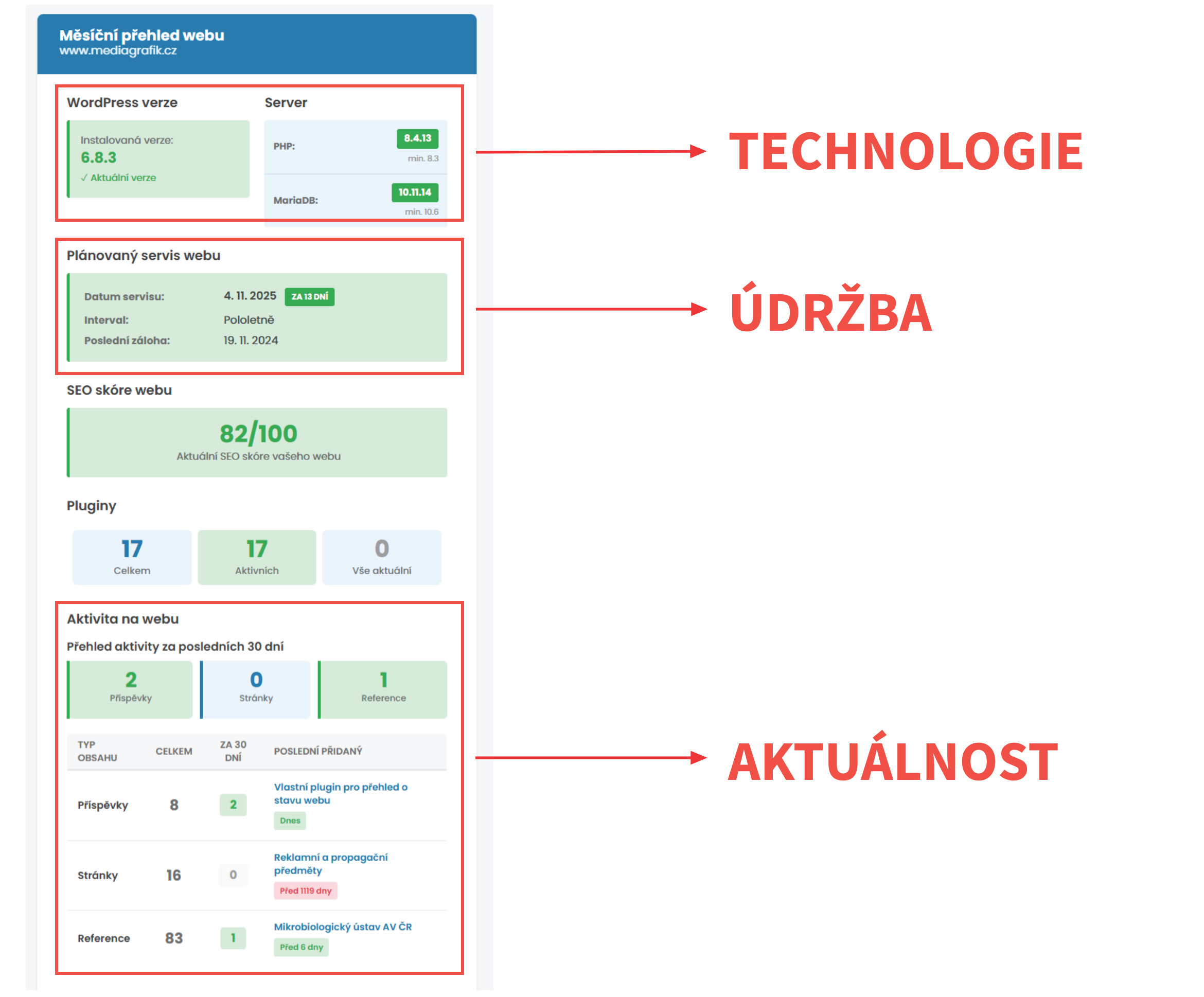 WordPress, pluginy i hosting se každý měsíc mění a vyvíjejí. A protože nechceme, aby se naši klienti o svých webech dozvídali až ve chvíli, kdy „něco přestane fungovat“, vyvinuli jsme vlastní plugin, který sleduje stav webu a automaticky o něm posílá přehledné měsíční reporty.