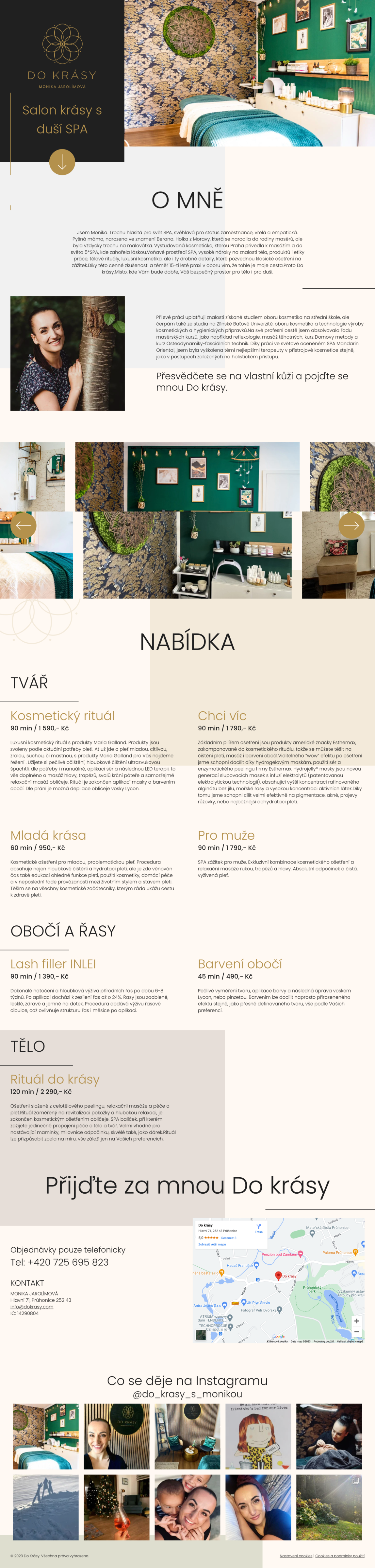 Představujeme vám další úspěšnou referenci – vytvoření webu pro salon krásy s duší SPA v Průhonicích. Jednou z našich výhod v MEDIAGRAFIKU je, že máme mezi námi ženu, která lépe porozumí potřebám našich klientek a tématu samotnému. Tento fakt se potvrdil při vedení projektu a spolupráci se salonem dokrasy.com. Udělali jsme maximum, abychom vyšli vstříc veškerým požadavkům klientky. Klientka je aktivní na Instagramu, proto je součástí hlavní stránky i prezentace jejich nejnovějších příspěvků.